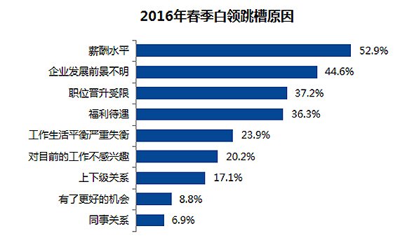 不过,随着2016年中国人才雇佣市场逐渐回归理性,大多数白领的跳槽选择趋向保守,在现有行业中寻找发展前景更好的下家成为主流。